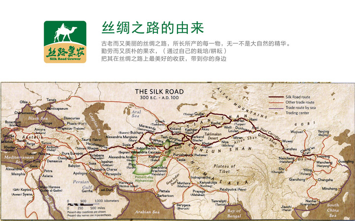 漫漫絲綢之路,書寫古老.燦爛.輝煌的中華文明。浩浩渺渺,起伏不斷的沙漠,秀美萬(wàn)千的山川,造就了今日的絲路果農(nóng)。優(yōu)越的地理環(huán)境,璀璨的中華文明,讓絲路果農(nóng)有了立足的物質(zhì)土壤和精神家園。絲路中國(guó),絲路新疆,絲路果農(nóng),讓我們一起成長(zhǎng)!