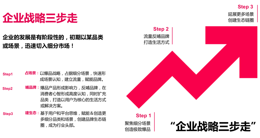 企業(yè)的發(fā)展是有階段性的,初期以爆品或場景,迅速切入細(xì)分市場!現(xiàn)代企業(yè)想要快速做大必須滿足企業(yè)戰(zhàn)略三步走,企業(yè)發(fā)展的不同階段戰(zhàn)略打法也不一樣,切勿本末倒置。通過完成第一步占場景,第二步哺品牌,第三步建生態(tài)。企業(yè)才能快速成為行業(yè)頭部品牌。